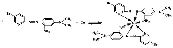 The purpose of the present study is to combine DLLME with GFAAS to develop a new method for the determination of trace copper in water samples. The DLLME- GFAAS combination is feasible and favorable for two reasons. First, DLLME involves preconcentration in a small volume of solvent and GFAAS only requires a few microliters of sample to carry out the determination. Secord, DLLME is an efficient separation and preconcentration approach and GFAAS is a highly sensitive technique. In the developed system, a laboratory-prepared 2-(5-bromo-2-pyridylazo)-5-dimethylaminoaniline (5-Br-PADMA) [30], which can react with Cu(II) to form a stable hydrophobic chelate and was found to be a good chromogenic reagent for spectrophotometric determination of copper, was used as the chelating agent. The structure of the copper chelate is shown in Scheme 1. The main parameters including the type and volume of extraction and disperser solvents, the concentration of the chelating reagent, the pH of the solution, and the extraction time were investigated and optimized. Under optimized conditions, the detection limit was 0.01 ng/mL for copper. The method was successfully applied to the analysis of real environmental water samples. The method was successfully applied to trace determination of copper in real environmental water samples and spiked samples with satisfactory results.