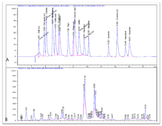 The chromatograms of (A) standard phenolic compounds and (B) CV crude extract.