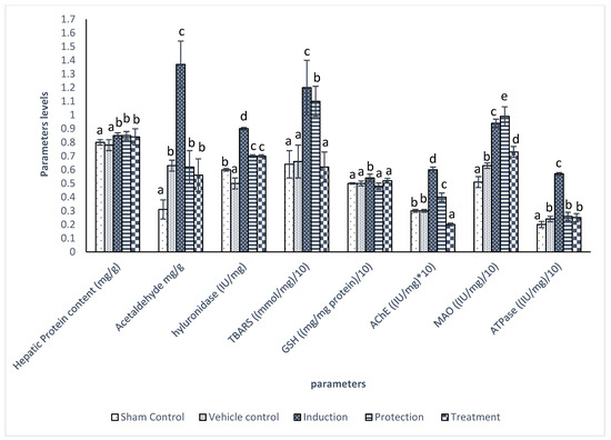 Effect of different treatments on hepatic protein, energy-producing markers (acetaldehyde and ATPase), oxidative stress markers (TBARS and GSH), neurotransmitter catabolizing enzymes (AChE and MAO), and fibrotic marker (hyaluronidase). Data are represented as M±SD. For each parameter, means with different letters are significantly different at p < 0.05. The mean with the letter (a) is the smallest, followed by b, c, etc. * is multiplication sign.