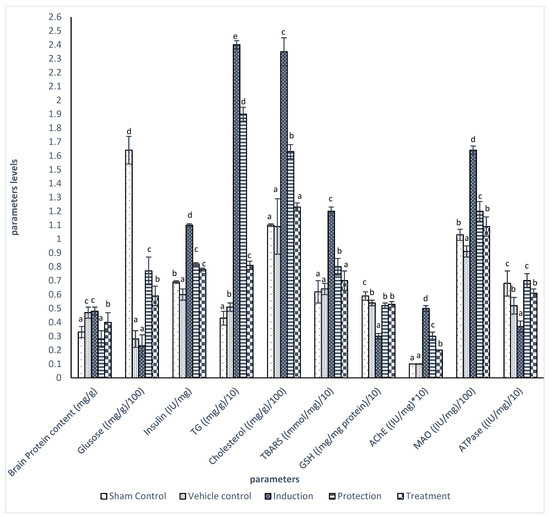 The serum levels of aspartate aminotransferase (AST), alanine aminotransferase (ALT), alkaline phosphatase (ALP), lactate dehydrogenase (LDH), serum and tissues protein level, serum and brain levels of glucose, cholesterol, and triglycerides beside serum HDL, LDL, and VLDL were measured using commercial kits, which were all obtained from Diamond Diagnostic (Egypt). Serum and brain insulin was measured using an Invitrogen commercial kit (Thermo Fisher, Waltham, Massachusetts, USA).