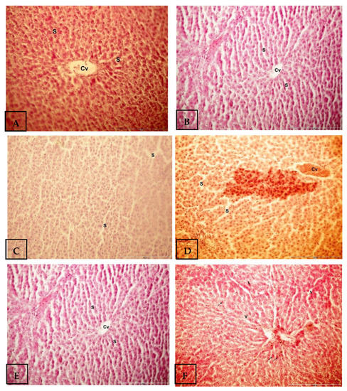 Histopathological changes in female rats stained with hematoxylin and eosin liver tissue samples under magnification 40X. (A) Sham control, (B), vehicle control, (C,D) induction group, (E) protection group, and finally, (F) treatment group. Cv: central vein, S: sinusoids, arrows: vacuolated nuclei.