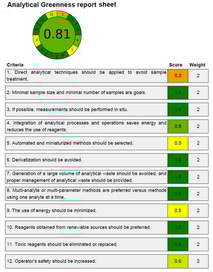 A number of analytical techniques are used to assess the greenness characteristics of analytical procedures [52,53,54,55,56]. Only the AGREE approach takes into account all twelve GAC principles while evaluating the analytical approaches’ greenness [54]. As a result, the new HPLC methodology’s greenness properties were identified utilizing the AGREE approach. The predicted overall AGREE score employing the twelve distinct GAC principles is summarized in Figure 4. Figure 5 includes the AGREE report sheet and AGREE score for each GAC concept. The different AGREE scores for each criteria of GAC were assigned by the AGREE calculator. The assigned scores ranged from 0.0 to 1.0. The established HPLC methodology’s overall AGREE score was 0.81, indicating that it possesses exceptional greenness properties for the measurement of CCM. The AGREE score for the reported analytical methods of CCM measurement has not been determined in the literature. However, the AGREE score for the HPLC assay of some other drugs has been reported recently [58,59]. The AGREE score for the HPLC assay of the emtricitabine measurement has been reported to be 0.72 using the AGREE calculator [58]. Similarly, the AGREE score for the HPLC assay of the doxorubicin measurement has been reported to be 0.79 using the AGREE calculator [59]. The recorded AGREE score for the HPLC assay of the CCM measurement was better than those reported for the measurement of emtricitabine and doxorubicin [58,59]. Overall, the greenness profile of the current HPLC assay was outstanding.