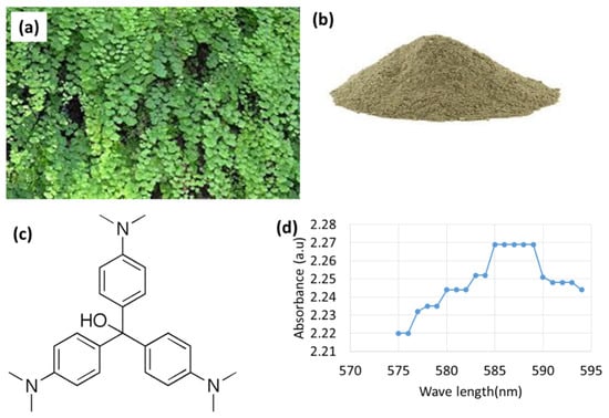 (a). Leaves of Adiantum capillus-veneris. (b). The powder form of adsorbent. (c) The structural formula of crystal violet dye. (d) Spectral measurements of absorbance as a function of wavelength of crystal violet dye.