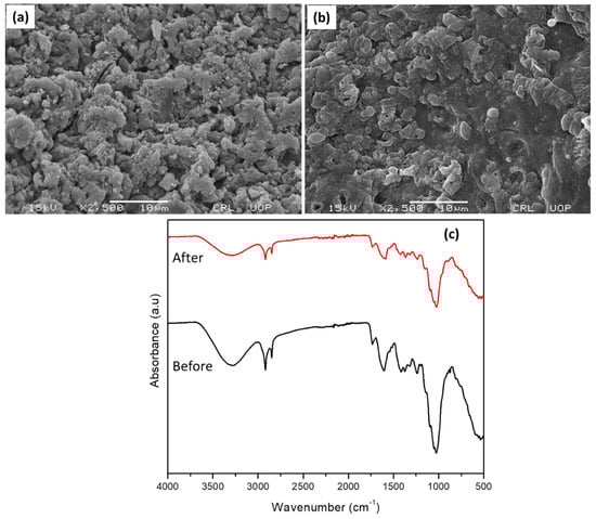 SEM images of Adiantum capillus-veneris (a) before (b) after adsorption of dye. (c) FTIR analysis of Adiantum capillus-veneris.