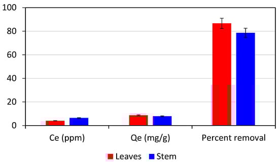 To check the adsorption efficiency of different parts of Adiantum capillus-veneris plant i.e., leaves and stem for crystal violet dye, a 50-ppm stock solution of crystal violet dye was prepared by mixing 50 mg of dye in 1 L of distilled water. In two 100 mL beakers, 20 mL solution was added using a graduated cylinder. A UV-visible spectrophotometer was then used to measure its absorbance. Following the addition of 0.1 g of adsorbent, both solutions were shaken on a digital orbital shaker for 80 min at 200 rpm. The absorbance of both solutions was then measured again after they had been filtered using filter paper. Finally, the dye solution’s final concentration was estimated. From Figure 3, the percent removal and Qe values of leaves were higher than that for a stem, so leaves were used as adsorbent for further study.