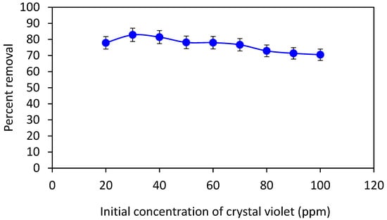 Plot of percent removal of crystal violet as a function of initial dye concentration at 0.1 g of adsorbent dose, 80 min contact time, 200 rpm shaker speed, and the volume of solution, 10 mL.