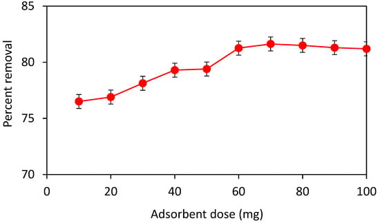 To select the optimum adsorbent dose, a 30-ppm stock solution of crystal violet dye was prepared in 250 mL of distilled water. The absorbance of the stock solution was recorded using a UV-visible spectrophotometer. In 10 (100 mL) beakers, 20 mL volume of the dye was taken using a graduated cylinder and each solution was loaded with a different dose of the adsorbent i.e., 10, 20, 30, 40, 50, 60, 70, 80, 90 and 100 mg. These solutions were then placed on a digital orbital shaker at 200 rpm for 90 min. After shaking, all these solutions were filtered using filter paper. Figure 6 shows a rapid increase in the uptake of crystal violet dye as a function of the adsorbent dose from 10 to 60 mg. Further increase in the adsorbent dose, however, did not result in any appreciable increase in the adsorption capacity; therefore, 60 mg is the optimum adsorbent dose. It might be since at lower adsorbent dosages (less than 60 mg) not enough sites were available for dye molecules. When the adsorbent dose was increased, the percentage removal was also increased which might be because of an increase in the adsorbent surface area. Further increase in adsorbent dose has no significant effect on percent removal. This may be because of numerous interactions, such as aggregation of adsorbent particles at increased dosage [32]. Such aggregation would result in a reduction in the adsorbent’s overall surface area and an increase in the diffusional path length which leads to decreased adsorption capacity [33].