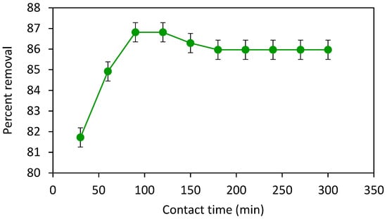 Time is one of the most important parameters that can affect the adsorption process. To optimize the contact time, a 30 ppm stock solution of crystal violet was prepared. After then ten 100 mL beakers were filled with 20 mL of 30 ppm dye solution with the help of a graduated cylinder. Each solution was loaded with 60 mg of adsorbent following shaking on a digital orbital shaker (200 rpm) at different contact times. For example, the first solution was shaken for 30 min, the second solution for 60 min, the third one for 90 min, and so on up to 300 min. The absorbance of each solution was monitored following filtration by using filter paper. The maximum percent removal of crystal violet dye was achieved at a contact time of 90 min which is presumed to be the equilibrium time; the amount of dye adsorbed does not show time-dependent change once equilibrated (Figure 7). Thus, within 90 min adsorbent active sites get occupied with dye molecules, and therefore, no further increase in percent removal was observed after 90 min. However, a small decrease in the percent removal of crystal violet might be due to desorption.