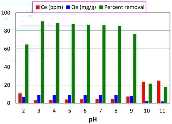 This experiment was performed to check and find the pH at which maximum adsorption will occur. For this, a 30-ppm solution of crystal violet dye was prepared and 10 solutions portions, having 20 mL volume, were taken in ten 100 mL beakers using a graduated cylinder. The pH of the solutions was maintained from 2–11 using 0.2 M HCl and NaOH solutions. Their absorbance was recorded. Each of the solutions was loaded with a 60 mg adsorbent, which was then placed on a digital orbital shaker at 200 rpm for 90 min. Following filtration after shaking for 90 min, the absorbance of the filtrate was recorded. At pH 3, the maximum percent removal was achieved as represented by Figure 8. The structure of the adsorbate, the charge on the adsorbent surface, and the ionization and dissociation of various surface charges on the adsorbent are all controlled by pH, which is crucial for dye adsorption [34]. The pH of the medium affects the strength of the electric interaction between ionized dye molecules. In solutions with varied pH levels, both the adsorbent and the adsorbatefunctional groups that are presentcan be protonated or deprotonated to produce different surface charges, resulting in electrostatic attraction or repulsion between the charged adsorbates and adsorbents [35].