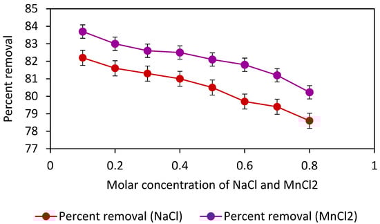 The effect of the presence of salt on the process of adsorption was also checked. A 30-ppm solution of the adsorbate (dye) was divided into eight 100 mL beakers having 20 mL dye solution and 60 mg of Adiantum capillus-veneris plant leaves powder (adsorbent) in each at constant pH 3. The concentration of NaCl was varied in each solution such as from 0.1 M to 0.8 M. Similarly, solutions were prepared for MnCl2 with the same salt concentration i.e., 0.1 M–0.8 M. All the solutions were placed on a digital orbital shaker at 200 rpm for 90 min. After 90 min of shaking, all these solutions were filtered using filter paper and their absorbance was noted. In addition, the absorbance was recorded for the solution without adding adsorbent because wastewater discharged from various industries contains a variety of salts; therefore, this study aimed to examine the impact of the presence of different ions on the process of adsorption [41]. Figure 11 reveals that an increase in salt concentration decreases the percent removal of crystal violet. This might be due to the electrostatic interaction of salt with adsorbate and various functional groups present at the surface of adsorbent as indicated by FTIR analysis, which results in low adsorption of dye molecules at the surface of the adsorbent. However, the adsorption efficiency of adsorbent was comparatively high even at high salt concentrations and thus can be used in saline water and real industrial wastewater.