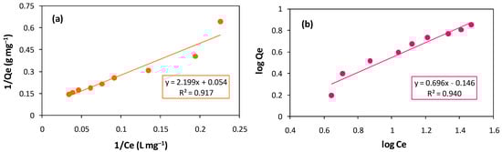 (a) Linear plot of Langmuir isotherm. (b) Linear plot of Freundlich isotherm.