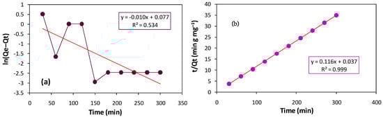 (a) Pseudo-first order kinetic plot. (b) Pseudo-second order kinetic plot.