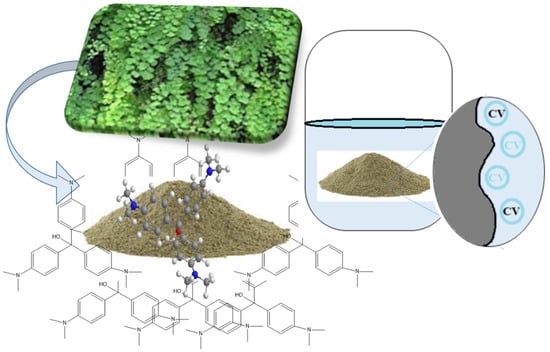 Malachite green and crystal violet are two of the triphenylmethane dyes that have been extensively used in the textile, food, aquaculture, and pharmaceutical industries. However, crystal violet and malachite green are exceedingly carcinogenic to a wide variety of organisms due to the existence of an aromatic chromophore group made up of delocalized p electrons, which causes biomagnification. It is very difficult to recycle and reuse industrial wastewater contaminated with such dyes, especially crystal violet dye. Due to its highly toxic nature and stable structure, it is extremely necessary to remove crystal violet from wastewater prior to its discharge to water bodies, and therefore, many researchers are working on the removal of crystal violet from wastewater using proper biosorbents [9,10,11,12,13,14,15,16,17]. For the purpose of removing Crystal Violet (CV) dye, the potential of powdered water hyacinth roots was investigated. At 500 ppm dye, 7.8 pH, and 27 °C, the biosorbent adsorbed 90% of CV at a dosage of 1.5 g L−1 [18]. In batch research, the leaf powder of Clerodendrum fragrans was used as a biosorbent to eliminate CV dye from textile effluent. At 19.44 ppm of CV, 30.9 °C, a solution pH of 5.03, and a biosorbent dosage of 1.27 g, the maximum removal efficiency of 96.72% was achieved [19]. Inactive biomass from Diaporthe schini was an intriguing biosorbent for colored effluents, with an effectiveness of 87% in the decolorization of a CV dye house effluent [14]. Red seaweed treated with citric acid showed a maximum CV biosorption performance of 93.40% from water under pH 7, 1.5 g L−1 of biosorbent, 20 ppm of CV concentration, and 90 min at 20 °C [20]. Crystal Violet Dye (CVD) removal from an artificial aqueous solution was investigated on the marine diatom alga Skeletonema costatum. The greatest adsorption efficiency (98%) was identified at 0.4 g of S. costatum, pH 3, 120 min of contact time, and 25 °C [21]. Modified rice bran (MRB) was investigated for its capacity to remove crystal violet (CV) from industrial wastewater. Chlorosulfonic acid was used for the modification of rice bran. At adsorbent dosage of 2 g L−1, initial CV concentration of 100 ppm, and contact time of 42.75 min, the highest removal effectiveness of 97.4% was achieved [22]. Maximum biosorption was produced by Punica granatum shell (PGS) in 2 h at 25 °C and a pH range of 5 to 10 by using 0.6 g of biosorbent [23].The most popular wastewater treatment techniques include membrane filtration, precipitation, flocculation, coagulation, biosorption, and electrochemical approaches [9,24]. These technologies don’t appear to be particularly effective or advantageous financially.