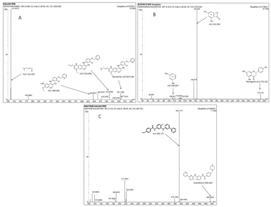 For better pharmacotherapeutic action, chemotherapeutic drug combinations with phytopharmaceuticals, especially antioxidants, have been extensively explored in the past few decades [15,16]. In this regard, we found naringenin (NRN) to be one of the potential phytopharmaceutical agents for various cancers, including breast cancer [17,18]. NRN potentially exhibits a dose-dependent increase in caspase-3 and caspase-9 activity-mediated apoptosis in breast cancer cells [17]. Additionally, it reduces cell proliferation and inhibits the migration of breast cancer cells via inflammatory and apoptosis cell signaling pathways. For the quantification of NRN in preclinical and clinical samples, a suitable bioanalytical method is required to understand the pharmacokinetic and pharmacodynamic behaviors of the drug. A score of research studies have documented the analytical estimation of NRN in biological matrices employing HPLC [19,20,21], LC-MS/MS [22], and related techniques. However, the sensitivity or lower limit of quantification (LLOQ) reported in the HPLC methods was in the range of 0.1–15 µg·mL−1 [19,20,21], while the LC-MS/MS method by Ma et al. (2006) reported double peaks for NRN in rat plasma despite a good LLOQ of 5 ng·mL−1 [22]. On the contrary, the current method showed a single peak for NRN with high resolution, although LLOQ was found to be 10 ng·mL−1, which is still good for the routine analysis of the drugs in preclinical and clinical samples.