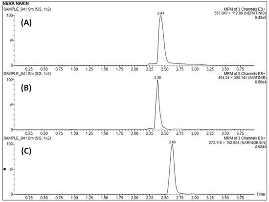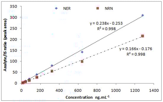 A single-step extraction procedure was used to extract NER, NRN, and the IS from the rat plasma. The procedure employed acetonitrile as the most suitable extraction medium with higher recoveries. The addition of acetonitrile helped in protein precipitation and the partition of the analytes and IS during the liquid–liquid extraction process. The extraction recovery was observed to be quite satisfactory for the investigated analytes and the IS. There were no other peaks observed for the plasma components except for the analytes and IS, which ratified a lack of interference with the analytes.