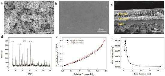(a) SEM images of NaY zeolite; (b) surface SEM images of the sandwich adsorptive membranes; (c) cross−section SEM images of the sandwich adsorptive membranes; (d) XRD of NaY zeolite; (e) N2 adsorption and desorption curves of the sandwich adsorptive membranes; (f) the curves of pore diameter distribution of the sandwich adsorptive membranes.