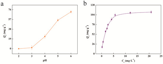 To explore the effect of pH, sandwich adsorptive membranes were added to 5 mg L−1 of Cu2+ aqueous solution (100 mL) with different pH (2.0, 3.0, 4.0, 5.0, and 6.0) at room temperature under stirring (40 rpm). It can be seen from Figure 3a that the Qe of the sandwich adsorptive membrane was obviously affected by the solution pH. With the increase in pH from 2.0 to 6.0, the Qe increased significantly from 0 to 71.75 mg g−1. NaY is a kind of porous aluminum silicate material with a three−dimensional pore structure. Na+ and K+ in its skeleton are the main exchangeable cations, and it is easy to have ion exchange with other cations in aqueous solution. In acidic water, a large amount of H+ will form ionic competition with Cu2+, resulting in the reduction in adsorption capacity []. With the increase in pH, the competition between H+ and Cu2+ is gradually weakened, and the adsorption capacity of Cu2+ increases gradually, reaching the maximum at pH 6.0. With the increase in pH, the Qe gradually increases. In order to avoid the hydrolysis of Cu2+ under alkaline conditions or neutral, pH = 6.0 was chosen as the optimal reaction condition.