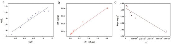 Static adsorption thermodynamics: (a) The fitting curve of Freundlich model; (b) The fitting curve of Langmuir model; (c) The fitting curve of D−R model.