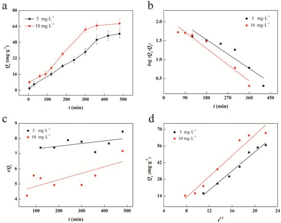 (a) Adsorption capacity with time of membrane at different concentrations; (b) Linear fitting of the pseudo−first−order model; (c) Linear fitting of the pseudo−second−order model; (d) Linear fitting of the intra-particle diffusion model.