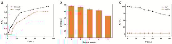 Dynamic adsorption of sandwich membrane: (a) Breakthrough curves; (b) Recycle numbers of membrane; (c) Dynamic adsorption of sandwich membrane in aspirin−Cu2+ mixed solution.