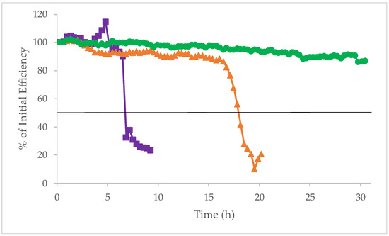 Effect of the water concentration of the challenge solution on the stability of 2.1 × 50 mm 1.7 μm ACQUITY UPLC BEH HILIC Columns, shown as % of initial efficiency vs. time of exposure to the basic solution. The columns were exposed at 70 °C to solutions containing an aqueous pH 11.30 ammonium bicarbonate (AmBic) buffer (green circles—20/80 v/v ACN/buffer; orange triangles—10/90 v/v ACN/buffer; purple squares—100% buffer).