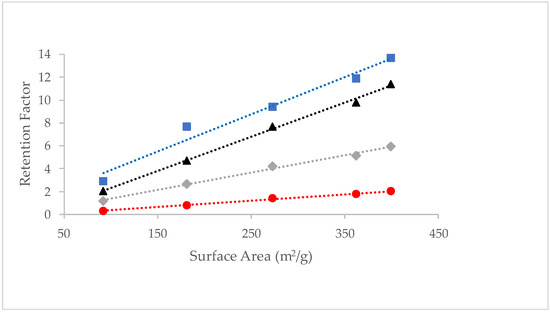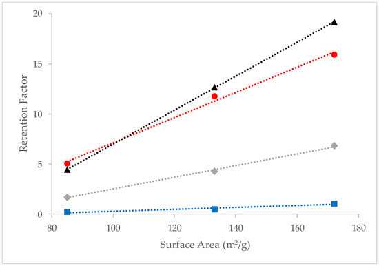 Dependence of retention factors on surface area for sulfobetaine-bonded BEH Columns at 70 °C with a 95/5 v/v ACN/200 mM ammonium formate pH 3.00 (aq) mobile phase (blue squares—TMPA; gray diamonds—adenine; black triangles—cytosine; red circles—TS). The dotted lines show the best linear fits for the data.