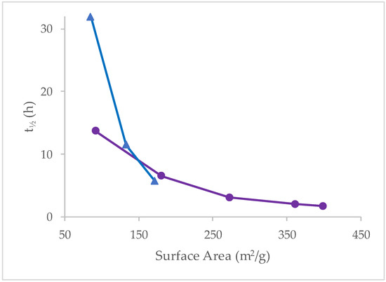 Dependence of time to 50% efficiency loss (t½) on surface area for unbonded BEH and BEH Sulfobetaine Columns at 70 °C with a 10 mM AmBic pH 11.30 (aq) mobile phase (purple circles—unbonded BEH; blue triangles—BEH Sulfobetaine).