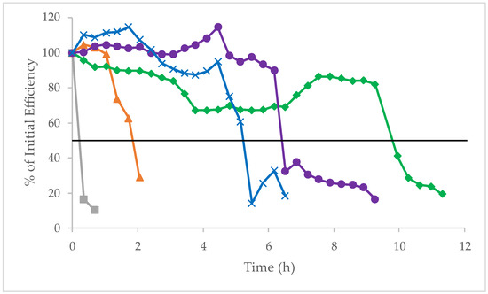 Column efficiency (% of initial value) vs. time exposed to 100% aqueous pH 11.30 AmBic buffer at 70 °C for five commercially available HILIC columns (gray squares—Luna NH2 Column; orange triangles—Poroshell 120 HILIC-Z Column; blue X—Atlantis Premier BEH Z-HILIC Column; purple circles—ACQUITY BEH HILIC Column; green diamonds—Torus Diol Column).