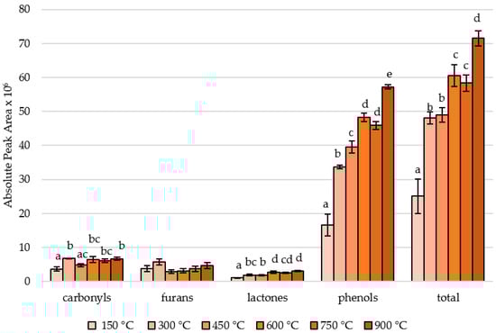 Absolute peak areas with standard deviation of the substance classes carbonyls, furans and lactones in food smoke depending on pyrolysis temperature. Different letters indicate a significant difference in absolute peak area of a substance class between different pyrolysis temperatures (p < 0.05, n = 3).