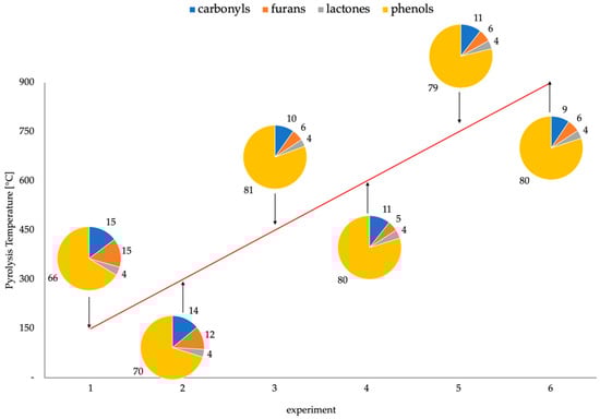 To obtain a clearer understanding of the dynamic change on the overall substance class, the relative distributions of the four substance classes were compared over the applied temperature range. It could clearly be shown that the phenols consistently had the largest proportion of the relative distribution, since this group also contains the highest number of compounds investigated. Nevertheless, the share of phenols in the total peak area increased significantly from about 70% to 80% when the pyrolysis temperature increased from 300–450 °C (Figure 2). At the same time, there was a significant decrease in the proportion of carbonyls from 14% to 10% and of furans from 11% to 6%. No change in the proportion of the total peak area observed for the lactones (4%) was found between the different pyrolysis temperatures. The relative peak areas of each substance class per applied pyrolysis temperature are shown in Figure 2 and a detailed overview is given in the Supplementary Materials Table S4.