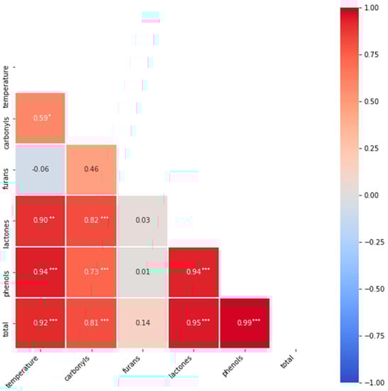 Correlation matrix between pyrolysis temperature and substance classes obtained via Pearson’s linear correlation analysis; total = sum of all target aroma compounds. Significance levels: * p < 0.05, ** p < 0.01, *** p < 0.001.