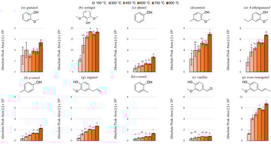 Absolute peak areas with standard deviation of individual phenols in food smoke depending on pyrolysis temperature. (a) Guaiacol, (b) syringol, (c) phenol, (d) creosol, (e) 4-ethyl-guaiacol, (f) p-cresol, (g) eugenol, (h) o-cresol, (i) vanillin and (j) trans-isoeugenol. Different letters indicate a significant difference in absolute peak area of a substance between different pyrolysis temperatures (p < 0.05, n = 3).