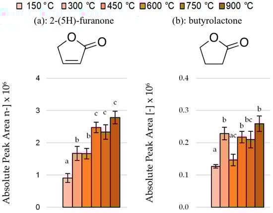 Absolute peak areas with standard deviation of individual lactones in food smoke depending on pyrolysis temperature. (a) 2-(5H)-furanone and (b) butyrolactone. Different letters indicate a significant difference in absolute peak area of a substance between different pyrolysis temperatures (p < 0.05, n = 3).