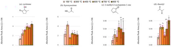 Absolute peak areas with standard deviation of individual carbonyls in food smoke depending on pyrolysis temperature. (a) cyclotene, (b) hydroxyacetone, (c) 2-methyl-2-cyclopenten-1-one and (d) diacetyl. Different letters indicate a significant difference in absolute peak area of a substance between different pyrolysis temperatures (p < 0.05, n = 3).