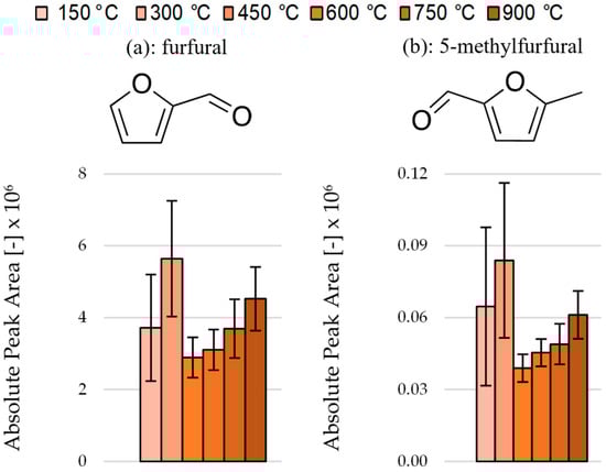 During the pyrolysis of hemicellulose, the glycosidic bonds and C–C bonds in the pyranose ring are dissolved first, releasing subunits. These are dehydrogenated at a temperature of 275–290 °C, resulting in the formation of furfural. These dehydration processes also produce compounds with keto groups and y-lactones, such as the 2-(5H)-furanone and butyrolactone studied here [12]. 2-(5H)-Furanone increased significantly during the increase in temperature (Table 3). These increases occurred in steps when the pyrolysis temperature was raised from 150 °C to 300 °C, and another increase occurred when the pyrolysis temperature was raised from 600 °C to 750 °C (Figure 5a). Butyrolactone is significantly higher at pyrolysis temperatures of 300 °C, 600 °C and 900 °C compared to temperatures of 150 °C and 450 °C (Figure 4b). A linear increase with increasing pyrolysis temperature cannot be deduced. Considering the relative peak areas to analyze the ratio of 2-(5H)-furanone and butyrolactone to each other of both lactones, only the temperatures 300 °C and 150 °C differed significantly.