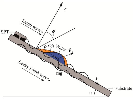 where A is the amplitude of the Lamb wave, is the angular frequency, is an attenuation constant, and is the coefficient of the energy dissipation. The acoustic streaming force obtained above acts as a body force near the interaction area between the droplet and substrate, with the direction being at the same angle as the radiation of the leaky Lamb wave. Moreover, the acoustic radiation of Lamb wave during the propagation will appear through the diffraction of waves at an angle of , which is called Lamb angle or Rayleigh angle. Accordingly, the Lamb angle and in water drop and oil drop can be calculated as . Therefore, , the direction of acoustic streaming force in the water drop is slightly more forward in the x-axis than that of an oil drop [89].
