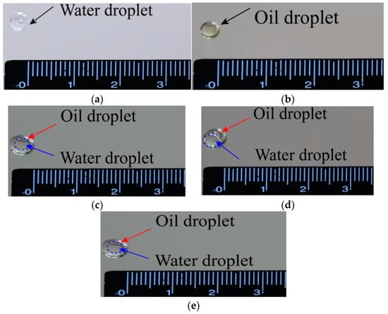 In this work, three approaches have been applied to form an oil/water mixed droplet on the substrate. Three approaches differ in the location or the order that oil and water droplets are placed on the substrate. In the first approach, a water drop is placed on the top of oil drop (Figure 3c). In the second approach, oil and water drops are placed on the substrate side by side (Figure 3d), while in the third method, an oil drop is directly put on top of a water drop (Figure 3e). It is obvious to observe the experimental phenomena that the oil/water mixed droplet in the first method is similar to the third method. Experimental phenomena demonstrate that the structure of a mixture does not mainly depend on the procedure of dropping droplets. In this work, the first approach is used as producing an oil/water mixed droplet.