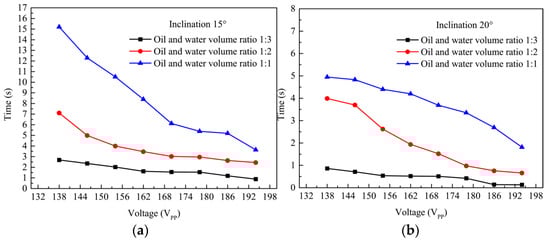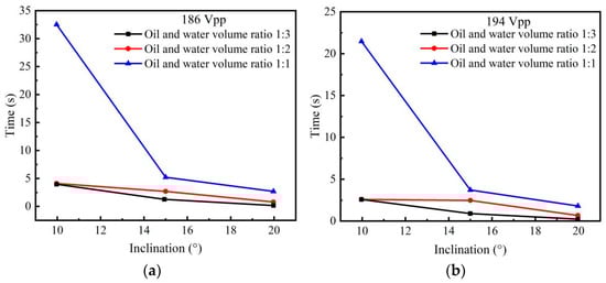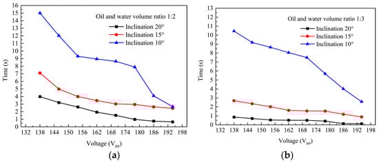 The relationship between the oil/water mixture separation time and the oil/water volume ratios varied from 1:1 to 1:3 with the substrate inclination angles are 15° and 20° has been explored in (Figure 7). According to the pictures with the same input power (Vpp), no matter what the inclination angles are 15° and 20°, the mixture separation time is the longest with oil/water volume ratio of 1:1, the mixture separation time is the shortest which the oil/water volume ratio is 1:3, and it can be seen that the mixture separation time with oil/water volume ratio 1:2 locates in the middle (Figure 7a,b). It is obvious to show that under a certain input power and a certain inclination angle, as the oil/water volume ratio becomes smaller and smaller, the separation time becomes shorter and shorter.