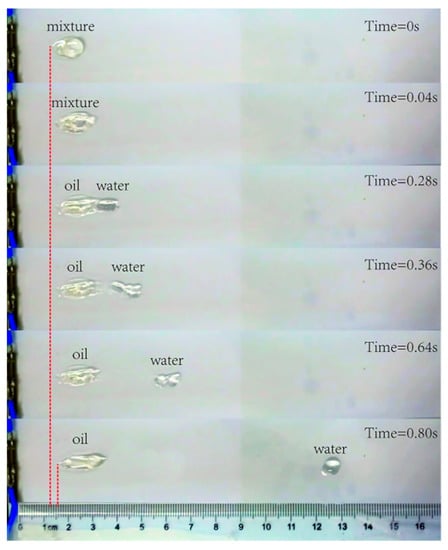 Test on glass substrate. Top view of separation of an oil/water mixed drop. The waves are propagating from left to right. Reproduced from Ref. [89].
