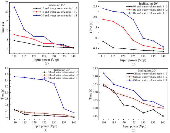 As shown in Figure 6, the separation time of the oil/water mixture extremely depends on the inclination angle. When the oil/water volume ratio and the input power are fixed, the larger the inclination angle, the faster the separation. Furthermore, for different input power, the trend lines are similar.