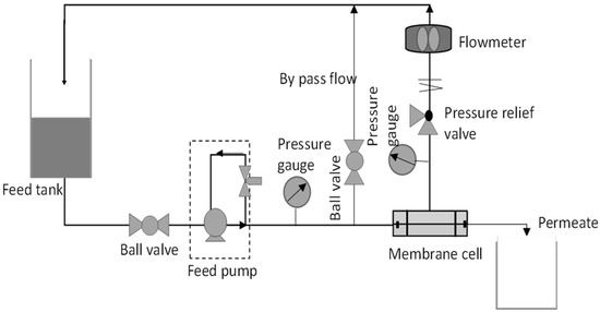 The antifouling test was performed by using cross flow filtration membrane system as shown in Figure 1 to simulate the actual membrane processes to reduce fouling propensity. When a flow is applied tangentially across the membrane surface, it is called cross flow filtration. Filtrate passes through the membrane surface when feed flows across it, while the concentrate collects at the opposite end. The membrane’s tangential flow causes a shearing effect on the membrane’s surface, which lowers fouling [21]. For testing, membrane samples were firstly cut into an effective area of 15.21 cm2. The membrane was then placed properly into the membrane cell module and DI water was used to fill the feed tank.
