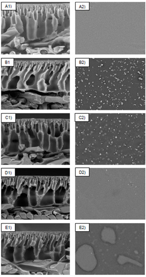 These aggregates appeared to have a negative impact on the membrane surface roughness, indicating that the surface morphologies of the PDA/Z-PEI membrane were considerably different from those of the PSf-PDA membrane. As the loading of PDA/Z-PEI increased, the finger-like structures were progressively extended and connected to the porous layer in cross-sectional scans of Figure 2(C1,D1,E1). Figure 2(A1,B1) indicate the development of macro-voids; however, macro-voids are less visible in the membrane where Z-PEI was injected (C1 to E1). This might be due to the inclusion of PDA/Z-PEI, which raises the viscosity of the dope solution. As a result, macro-void formation was decreased [20].