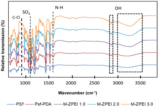 As shown in Figure 3, FTIR was utilised to characterise the presence of functional groups on membrane surfaces. Except for PSf-PDA, the spectra of all PDA/ZPEI membranes displayed a distinct absorption peak at 1039 cm−1, which is attributed to the existence of the SO3 groups of zwitterionic structure [20]. In comparison, the PSf-PDA spectra does not show this peak, indicating that PDA does not contain any zwitterionic features. On the other hand, the peaks at 1570 and 1650 cm−1 refer to the N−H and C−N vibrations of PDA/PEI, indicating that the membrane has been successfully coated with PDA/Z-PEI. Similarly, the absorption peak at 832 cm−1 (C–Cl stretching vibration) is more intense in the PSf-PDA membrane, but when Z-PEI loading rises, the depth of the spectrum diminished [22]. These results demonstrated that the quaternary amination process has successfully occurred [15].