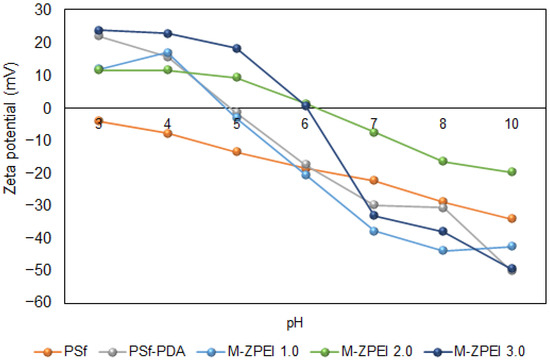 The effect of zwitterionic polymer (Z-PEI) on the surface charge of membranes was characterized by using zeta potential analysis as shown in Figure 4. Based on this figure, at a pH below 5 and 6, all ZPEI membranes are have positive charges. At a pH around 5.0, PSf-PDA membrane and M-ZPEI 1.0 showed iso-electric point (IEP) of 0 mV. The potential values started to turn negative at pH 7.0 (neutral pH), −5 mV for 1.0 Z-PEI, −9 mV for 2.0 Z-PEI, and −22 mV for 3.0 Z-PEI. The zeta potential of the membrane becomes more negative as the loading ratio of Z-PEI increases. This finding indicates that the Z-PEI was hydrated when it was mixed with PDA in a PBS solution [23]. The negatively charged hydrated Z-PEI in the membrane does not dissociate in water [20] due to hydroxide ion adsorption from water self-ionization [24]. The surface charge should be able to repel the charged solute in the AT-POME to increase colour pigment rejection. As the membrane surface charge became more negative, the colour pigment rejection increased [23].