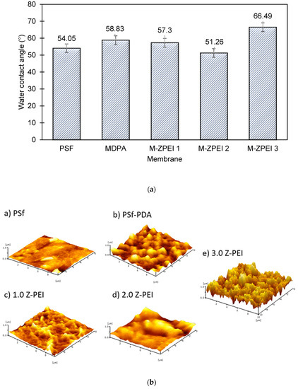 Surface hydrophilicity analysed by the water contact angle (WCA) measurement serves as a good indicator to define the movement of water across the membrane. The composition of membranes and its corresponding surface chemistry has eminent effects, especially in terms of the water interaction which is related to its wettability. In brief, for membranes used for water/wastewater treatment, the hydrophilic surface is often favourable. Membranes with hydrophilic surface typically contain water-loving active functional groups that are able to form “hydrogen-bonds” with water molecules [15]. Based on Figure 5a below, the WCA of the PSf membrane was 54.05°. When PDA was incorporated on the PSf membrane, the WCA increased to 58.83°. Although PDA consists of many amine functional groups that can attract water molecules, their ability is possibly hindered by the stacked aggregates, which caused resistance for water molecules being transported via membrane pores. The stacked aggregates can be further confirmed by AFM images, as shown in Figure 5b. Based on Figure 5b, it can be seen that coating with PDA led to a rougher membrane surface. After that, when Z-PEI was introduced, a slightly lower water contact angle was achieved, due to the interaction of amine groups from PEI and PDA that attracts water molecules to the surface of the membrane.