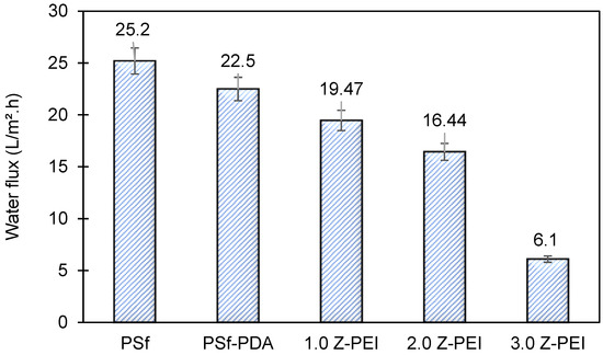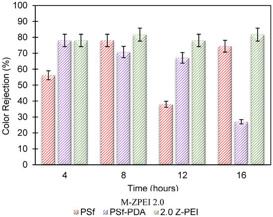 In brief, pure water permeability (PWP) is defined as the volume of water that passes via membrane per unit time per bar [25]. Briefly, it shows the ability of membranes to generate permeates at a given time. Figure 6 shows the PWP of PSf, PSf-PDA and MZPEI membranes fabricated in this study. From the figure, it can be seen that the water flux of M-ZPEI membranes are lower, ranging from 19.47, 16.44 and 6.1 L/m2·h for M-ZPEI 1.0, M-ZPEI 2.0 and M-ZPEI 3.0 as compared to PSf (25.2 L/m2·h) and PSf-PDA (22.5 L/m2·h) Initially, it is hypothesized that the water flux will be improved due to the presence of hydrophilic functional groups on PDA and PEI, which attract more water molecules to form a water layer on the surface membrane. However, in this study, we achieved lower water flux for M-ZPEI. We suspected that such aggregates, which initially formed during PDA coating as shown in our previous data, cause an increase in terms of water resistivity. In addition, as the loading of PEI increased, the membrane will have a thicker coating that resulted in water transport resistance, and eventually resulted in a lower water flux. Nevertheless, the thickness of PDA-PEI may assist in a better rejection of colour from AT-POME.