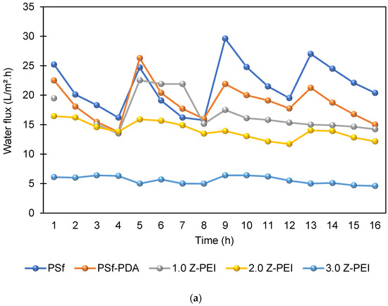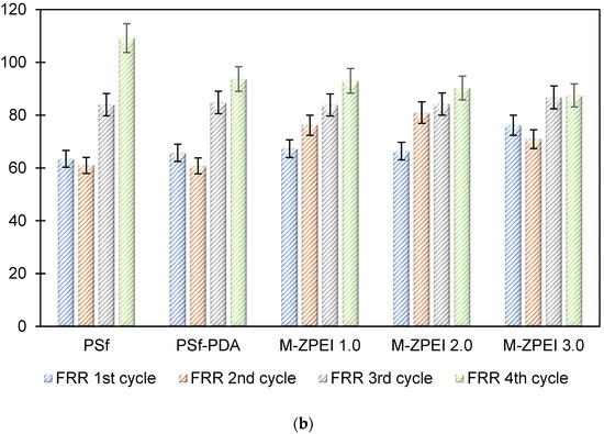 The antifouling property of the membranes was investigated in which the flux of the membranes and their flux recovery ratio (FRR) were evaluated using AT-POME in a cross-flow filtration membrane system. Previous research has shown that water molecules may rearrange and firmly attach on zwitterionic groups via electrostatic interaction, forming a hydration layer that can prevent foulant contact with the membrane surface [26,27]. As a result, the accumulated foulants may be eliminated using water washing, thereby preventing irreversible fouling as shown in Figure 7. Figure 8a shows results of antifouling evaluation after four cycles by PSf, PSf-PDA, and Z-PEI membranes. Even though the initial fluxes of controlled membranes (25.2 L/m2·h for PSf and 22.5 L/m2·h for PSf-PDA) were higher than modified PDA/Z-PEI membranes (19.47 L/m2·h, 16.44 L/m2·h for ZPEI 1.0, ZPEI2.0 PDA/Z-PEI and 5.92 L/m2·h for 3.0 PDA/Z-PEI), but the control membranes experienced severe fouling, hence the flux drop was very significant in every cycle. On the other hand, ZPEI membranes have shown excellent antifouling property by managing the better stability of the membranes. This is attributed to the covalent connection established between the Z-PEI and PDA membranes, which then provide a stable antifouling feature to the PDA/Z-PEI membrane [20].