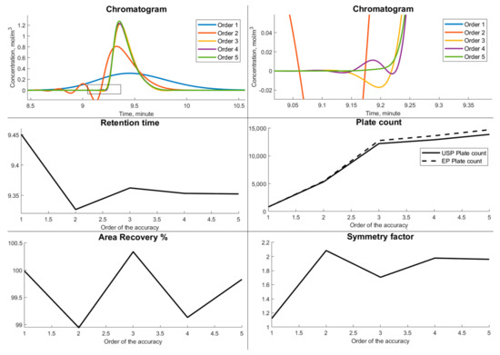 The comparison of the chromatograms produced by schemes with different orders of accuracy is presented in Figure 2. From the results, a clear improvement can be observed when increasing the order of accuracy. The parameters demonstrating the peak shape and position, namely, the plate count, symmetry factor, and retention time, approach equilibrium values as the order of accuracy goes higher. The area recovery, calculated by dividing the area of the peak with the area of the injection pulse, reflecting the mass conservation properties of the model, is also converted to 100% as the order of accuracy increases. A further inspection of the peak bases depicts an apparent advantage of the higher-order scheme in reducing the oscillation produced by the error of the approximation schemes.