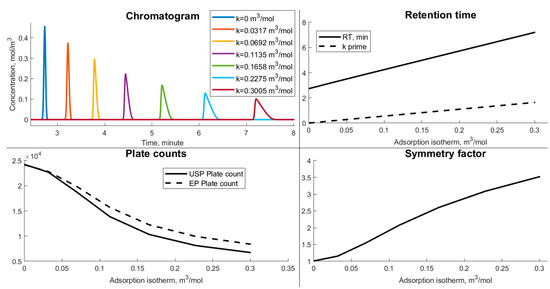 The effect of the absorption isotherm on the chromatogram and suitability parameters are depicted in Figure 3. The retention factor is directly proportional to the absorption isotherm. The retention factor has a linear relationship with the absorption isotherm, and it intercepts the y axis at the retention time of the non-retained component which was used to calculate the porosity of the column. This makes sense because the tracer has an isotherm or/and capacity equal to zero. Running a simulation with either the isotherm or capacity or both equal to zero and comparing the retention time with the dead time is one way to test the model. The increase of the absorption isotherm causes the rise of the asymmetry factor. This is because the absorption isotherm curve will become stiffer and curvier when the absorption isotherm goes up. The higher the isotherm is, the lower the plate count will be. This phenomenon is caused by the combination of two factors, the retention time and asymmetry factor. Firstly, the longer the component retains in the column, the higher the effect of the peak broadening will be. Secondly, the increase of the asymmetry factor is always accompanied by the downfall of the column efficiency and the decrease in plate count.