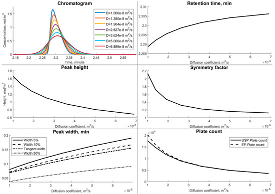 The effect of the diffusion coefficient on the chromatogram and suitability parameters are shown in Figure 4. From the figure, the diffusion coefficient is responsible for the broadening phenomenon of the peak. When the diffusion coefficient increases, the peak height will drop, and the peak width will broaden until some point where they become relatively stable. This leads to the decrease of the column efficiency and the decline of the plate count. The diffusion coefficient also helps stabilize the peak because the higher the diffusion coefficient, the more symmetric the peak will become. This causes the diffusion coefficient to affect the retention time a little, because the asymmetry factor decrease will slightly raise the retention time.